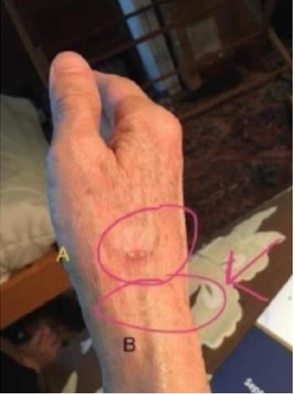 The spots had already begun to form blisters. I got the NANO SOMA and sprayed a little into my hand and dabbed some on the spot on my wrist (B). I didn’t put any on the area where you see the blister (A). When I woke up the next morning, there was no sign of the spot at B. Even when I touch the area with significant pressure, there’s no indication of any injury whatsoever. This is an amazing product!”