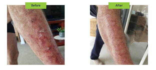 Last, we have this Before and After from Bill S., who was advised to use a certain prescription cream on his leg to assist a skin issue. Like many, however, his skin had a strong response, leaving it red and visibly irritated (Before).
